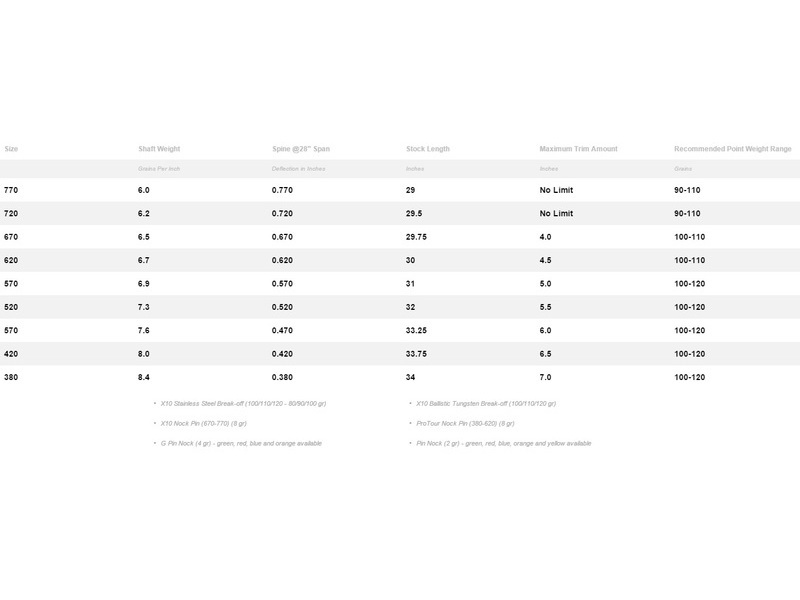 Easton X-10 Pro Tour şaft, dünya çapındaki profesyonel okçular tarafından tercih edilen, rüzgar sapmasına karşı en dirençli ok profili ile tasarlanmış, elit seviye bir karbon-alüminyum hibrit şafttır. Çekirdeğinde 7075 alaşım bulunan bu model, yüksek mukavemetli karbon fiberle kaplanmış ve 9 mikronluk cilalı karbon yüzeyi ile maksimum aerodinamik verimlilik hedeflenmiştir. ±.0015” doğruluk ve ±0.5 tane ağırlık toleransı ile olağanüstü tutarlılık sunar. Uç, arkalık ve tüy gibi bileşenler ayrı olarak satılmaktadır.