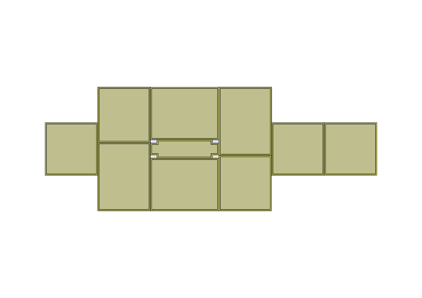 Set, farklı ölçülerde toplam 10 adet minderden oluşmaktadır: 2 adet 260 x 200 x 20 cm, 2 adet 260 x 200 x 20 cm özel ayak yuvası olan, 2 adet 210 x 200 x 20 cm, 3 adet 200 x 200 x 20 cm ve 1 adet 260 x 70 x 20 cm ölçülerindedir. Minderlerin içeriği 22 dansite konvansiyonel süngerden üretilmiştir ve üst katmanda sertleştirilmiş yapı için XP, halı vb. malzemelerle laminasyon yapılmıştır.
