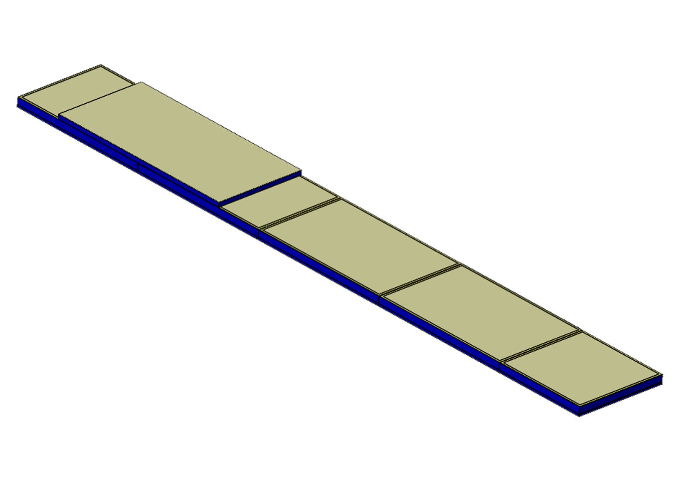Set, farklı ölçülerde toplam 6 adet minderden oluşmaktadır: 4 adet 300 x 200 x 20 cm, 1 adet 200 x 200 x 20 cm, 1 adet 400 x 200 x 10 cm ölçülerindedir (belirtilen m² dışında). Minderlerin içeriği 22 dansite konvansiyonel süngerden üretilmiş olup, üst katmanda sertleştirilmiş yapı için XP, halı vb. malzemelerle laminasyon yapılmıştır.