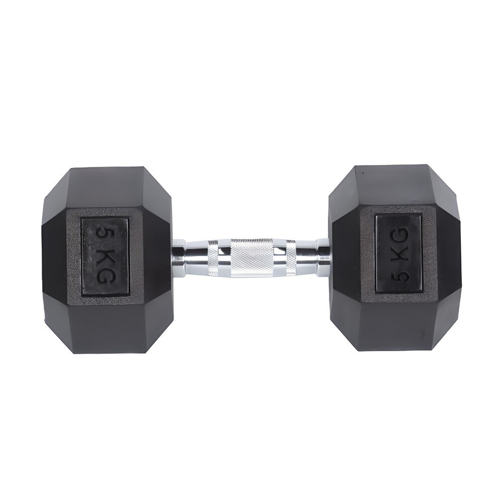 Helix Kauçuk Dambıl 5 KG, tırtıklı çelik saplı ve kauçuk kaplı dökme demirden üretilmiş, evde ve spor salonunda başlangıç seviyesi fitness antrenmanları için ideal, dayanıklı bir dambıldır.